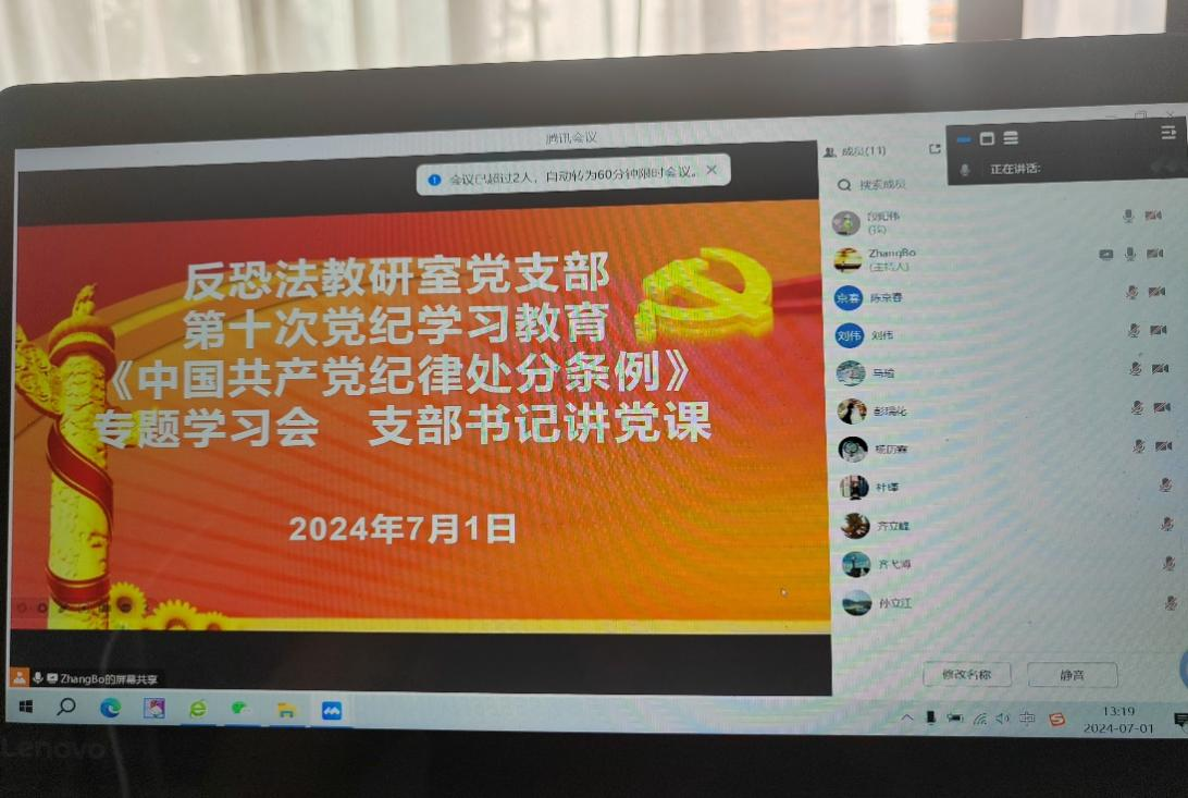 7月1日上午,追影猫 反恐怖主义法教研室党支部在线上召开党纪学习教育专题研讨会暨支部书记讲党课活动。会议由党支部宣传委员段阳伟主持,支部全体党员参加会议。