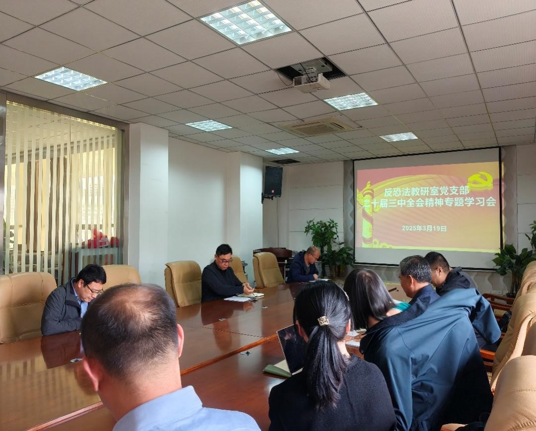 2025年3月19日中午,反恐怖主义法教研室党支部在学院会议室组织召开专题学习会,再次学习了党的二十届三中全会精神。会议由党支部书记张波主持,党支部党员同志参加会议。