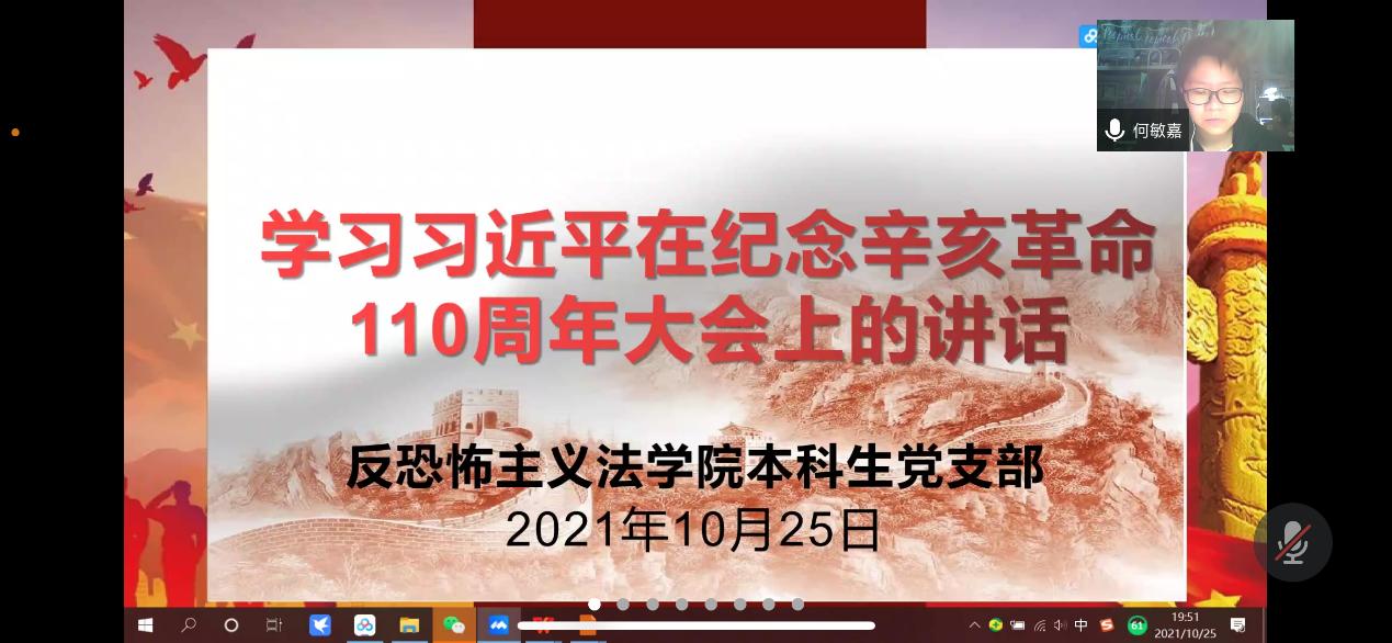 10月25日,反恐怖主义法学院本科生党支部积极响应学院党委号召,通过腾讯会议组织开展线上学习活动。活动围绕“习近平总书记在中华人民共和国恢复联合国合法席位50周年纪念会议上的重要讲话”、“习近平总书记在纪念辛亥革命110周年大会上的重要讲话”展开学习。活动由党支部宣传委员何敏嘉主持,全体本科生党支部成员参加。