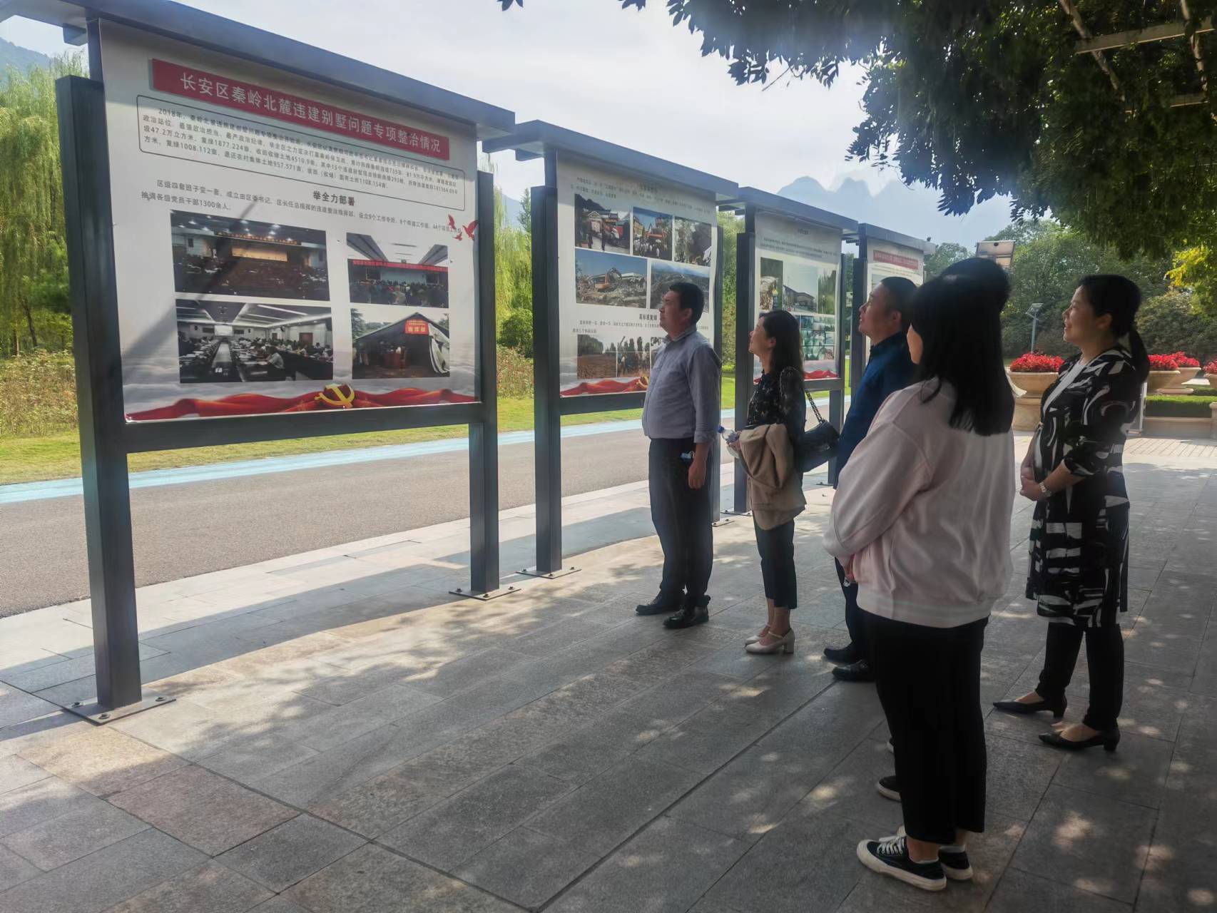 党员们首先参观了秦岭北麓违建项目整治改造成果展览板,了解了违建别墅在整治前、整治中、整治后的深刻变化,切身感受到了习近平总书记关于“绿水青山就是金山银山”的发展和实践理念。