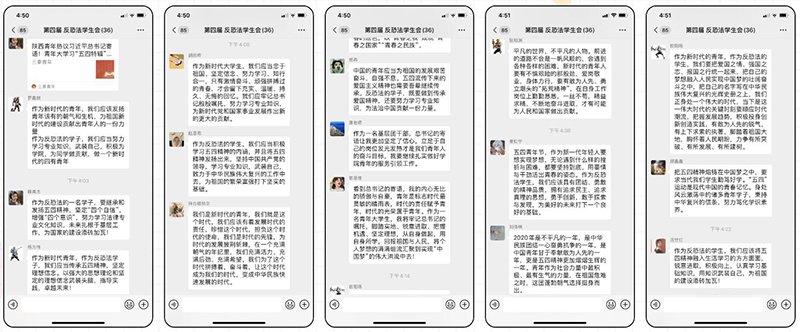 反恐怖主义法学院团委号召各班依托网络平台积极开展线上讨论活动。各班团支部组织云端班会,学习习近平总书记重要讲话精神和青年寄语。会后,同学们在微信群展开热烈讨论,湖北籍的同学、少数民族同学与抗疫志愿者们结合自身实际情况分享对爱国主义和五四精神的理解,交流、感悟新时代爱国主义与青年勇于担当的精神。