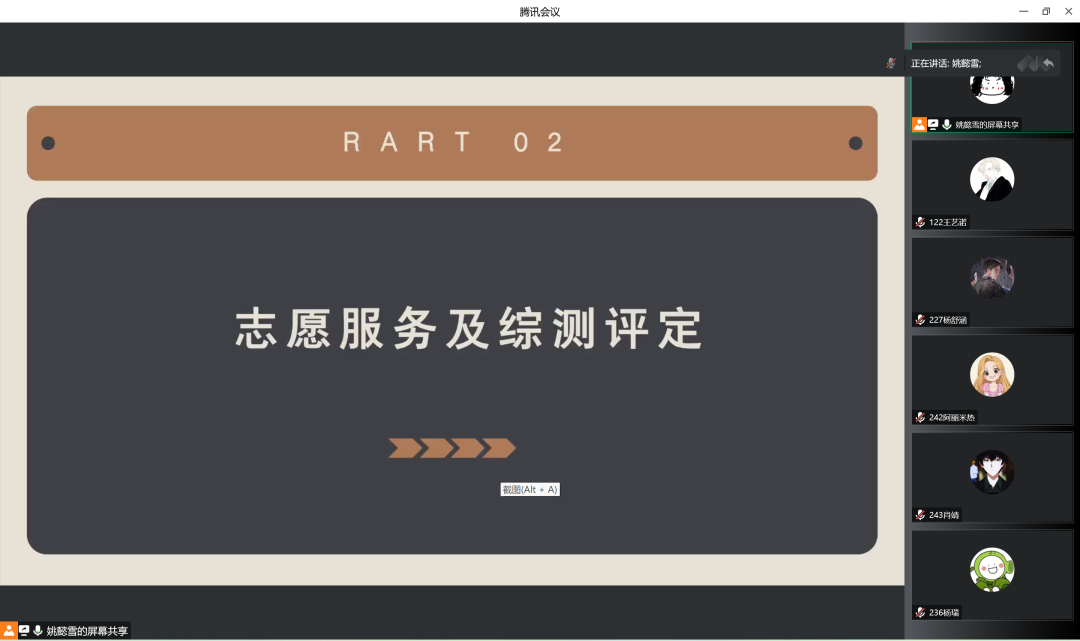 姚懿雪同学结合学生手册对于志愿服务及综测评定做出了细致讲解包括志愿服务时长、综合素质测评的各项标准等,这也为2022级新同学们对未来学习的规划和树立综合发展的目标提供了有价值的参考。