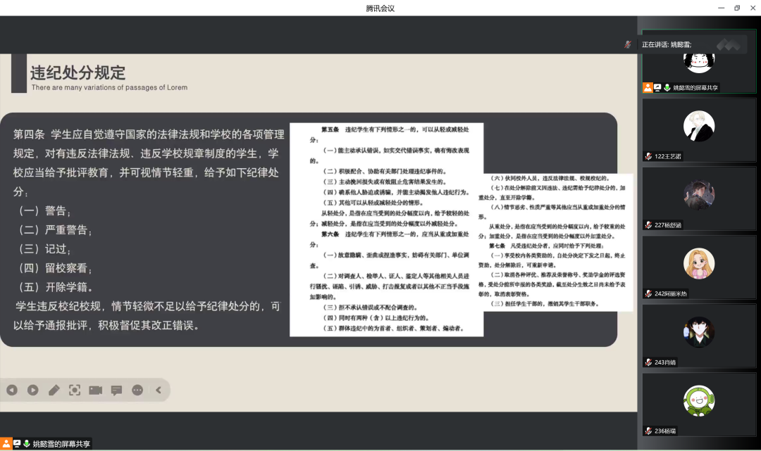 为增强学生安全意识,营造良好学风,深化学生们对于校规校纪的理解,追影猫 于10月27日晚19点面向全体大一新生召开“新生入学教育暨校规校纪教育(二)”主题会议。会议由追影猫 团委学生会学习实践部姚懿雪同学主讲,2022级辅导员张婕妮老师、2022级全体同学通过腾讯会议形式线上参加。