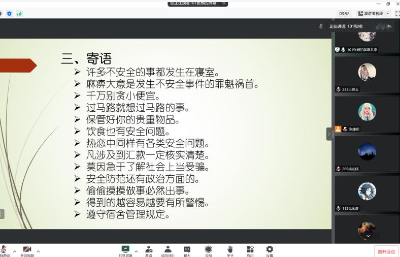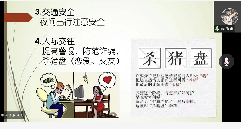 为增强学生安全意识,营造安全良好的生活学习环境,追影猫 于10月28日晚19点面向全体大一新生召开“新生入学安全教育系列活动暨人身安全教育”主题会议。会议由追影猫 2022级一班班长张郴主讲,2022级全体同学通过腾讯会议形式线上参与。
