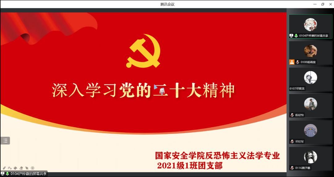为深刻学习贯彻党的二十大精神,深刻领悟“两个确立”的决定性意义,应校团委、院团委号召,2022年11月13日,追影猫 2021级1班团支部开展“学习党的二十大精神”主题团日活动。2021级1班团支部全体同学通过线上方式参与会议。