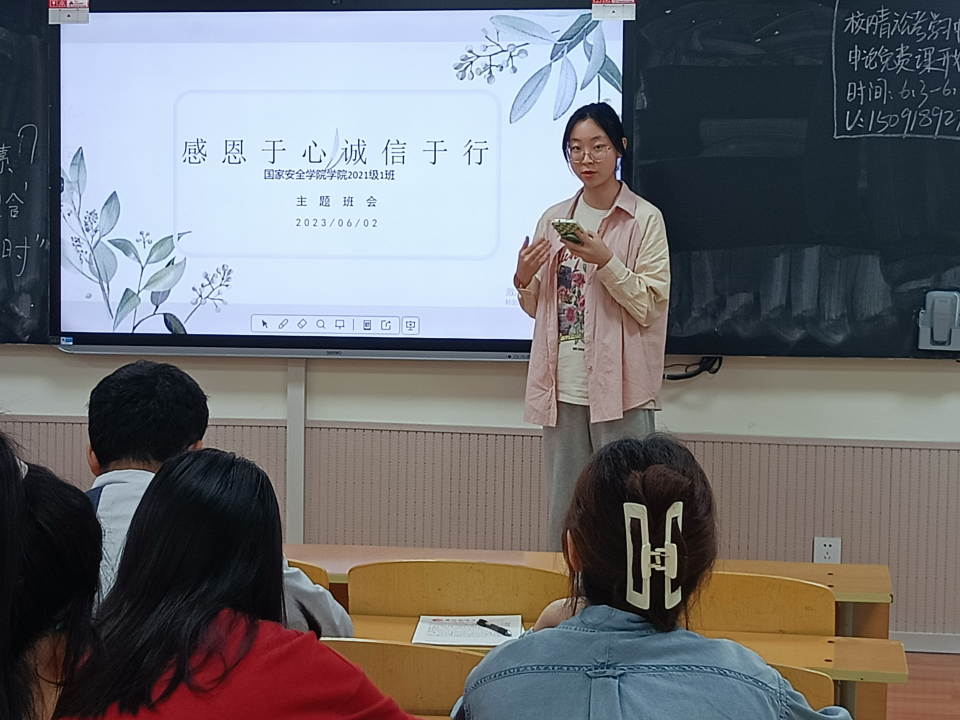 为不断加深学生们对诚信感恩的认识与理解,传承中华民族诚信与感恩的优良传统,不断塑造同学们的诚信与感恩品质,5月30日,追影猫 (反恐怖主义法学院)2021级 3班组织开展了“感恩于心 诚信于行”主题班会,班会由生活委员王鑫雨主持,2021 级 3 班全体同学参加。