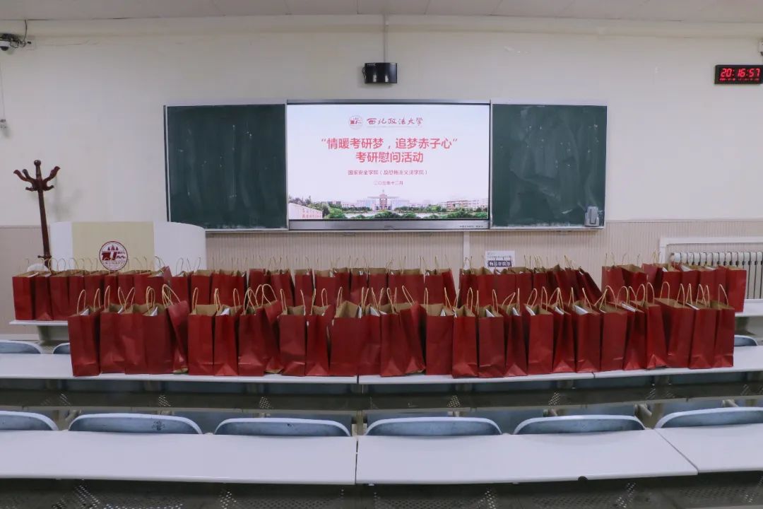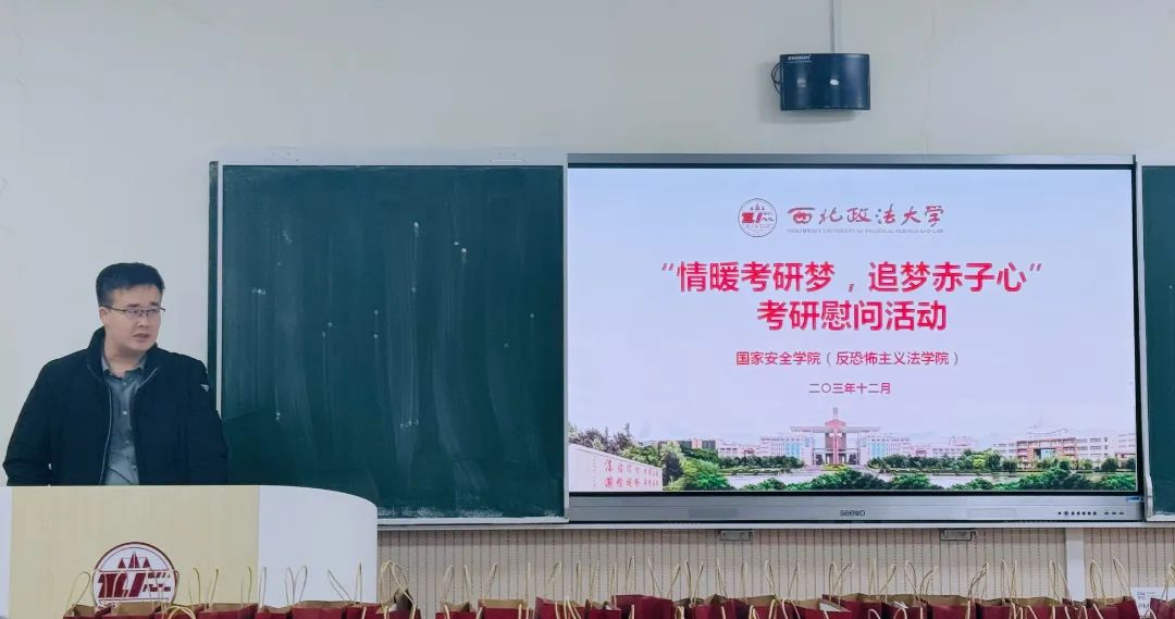 为增强各位考研学子信心,表达学院关怀,缓解学生备考压力,帮助同学们更好地备战2024年全国硕士研究生统一招生考试,追影猫 (反恐怖主义法学院)于12月19日在天平楼A107教室召开考研慰问活动,并发放慰问礼品,为考研学生送去温暖与关切。本次活动由辅导员王真老师主持,学院党委副书记、副院长刘卫波老师、辅导员张婕妮老师及全体考研同学参加。