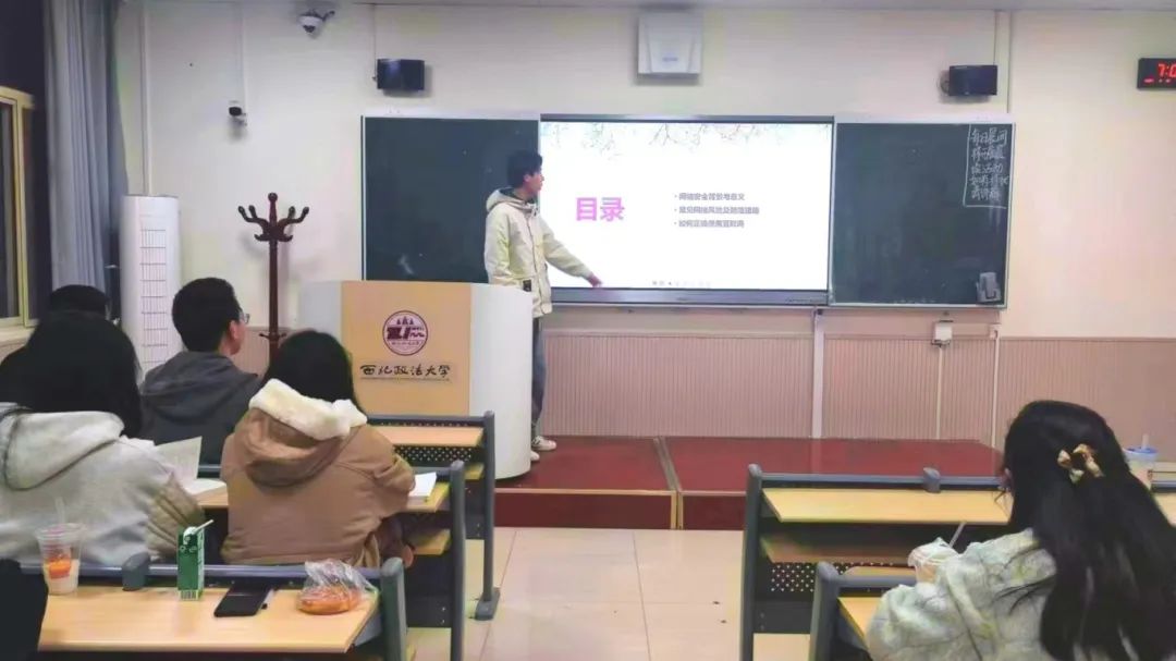 为提升大家的网络安全意识,培育风清气正的网络空间,追影猫 (反恐怖主义法学院)2023级2班于3月14日组织开展“大学生网络安全教育”主题班会,本次班会由常瑞峰同学主持。