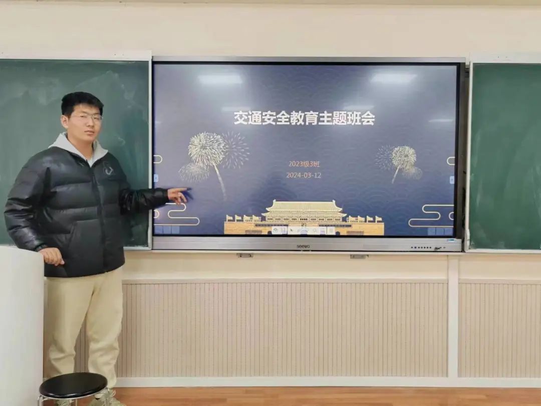 会上,张云哲同学从交通安全现状、交通安全法规与常识、校园内外出行安全注意事项等方面出发,分享了交通安全相关知识,提醒各位同学要遵守交通规则,珍爱生命,养成良好的交通规则意识。