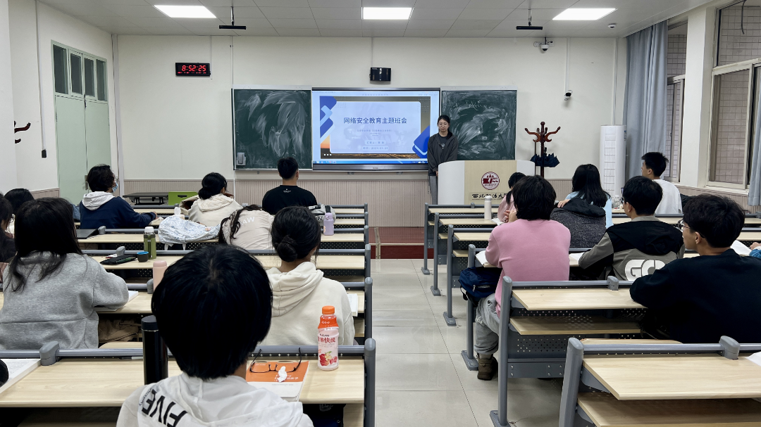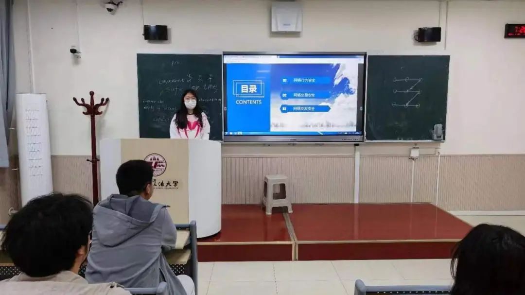 陈玉洁同学通过讲解PPT、观看网络安全相关视频等方式向同学们普及网络安全知识,并结合生活实际,提醒同学们在日常生活中增强网络安全意识,学会辨别网络诈骗,避免掉入网络诈骗的陷阱,从自身做起保护个人信息安全。