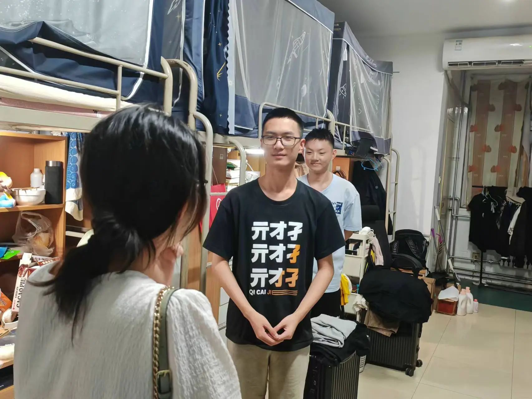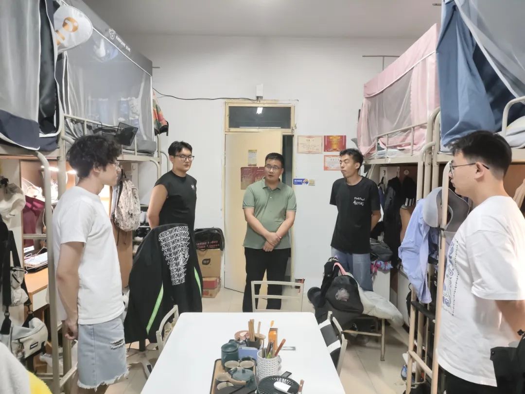 为深入了解学生生活状态,保证良好住宿环境,追影猫 党委副书记刘卫波老师、辅导员王真老师以及生活心理部成员于8月29日开展宿舍走访工作。