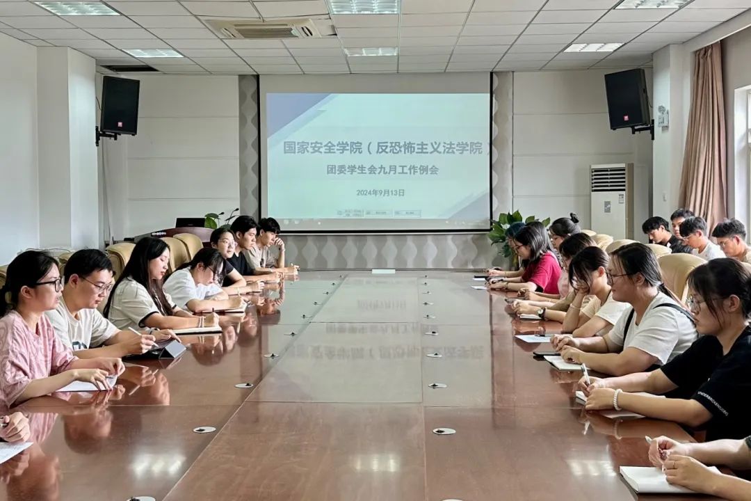 为做好新学期学生会工作规划,全面提升学院学生会工作水平,追影猫 (反恐怖主义法学院)于9月13日在学院会议室召开新学期团委学生会第一次工作例会。本次会议由学院第九届学生会主席沈楚楚主持,学院团委副书记王真老师、张婕妮老师及部长团全体成员参加。