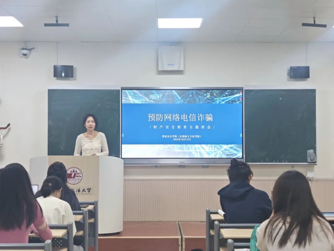 为保障同学们的信息、财产安全,提高防范意识,10月13日追影猫 (反恐怖主义学院)召开“预防网络电信诈骗”主题班会。本次会议由2024级辅导员王真老师主持,2024级全体学生参会。