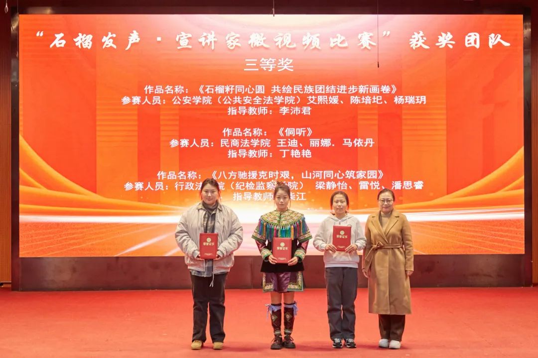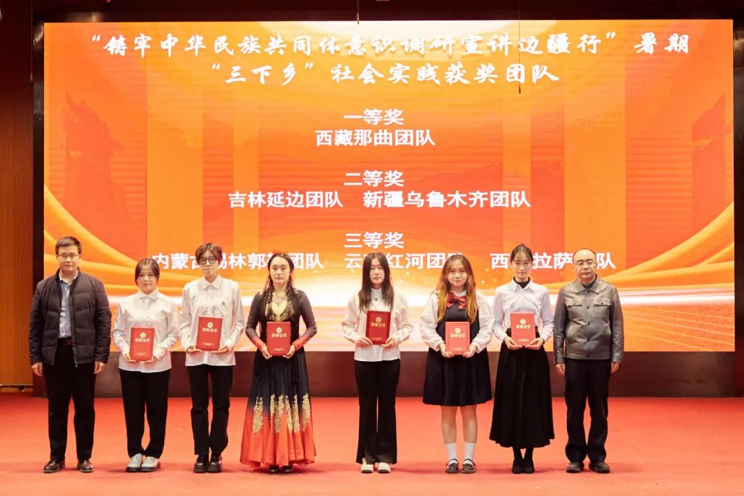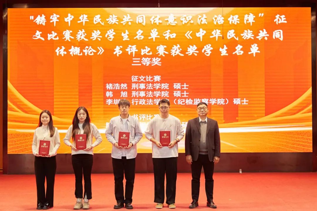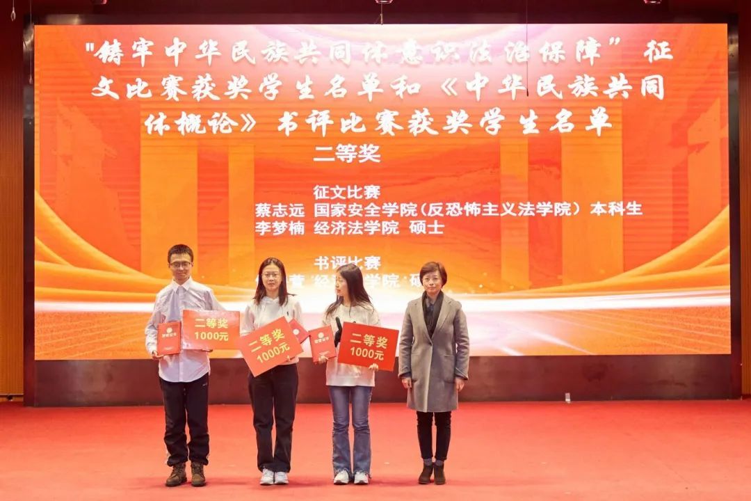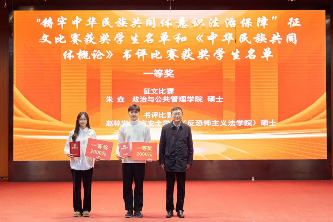 大会分别对“中华风韵”手工作品制作大赛、“56个民族,56朵花”海报作品制作大赛、“石榴发声·宣讲家”微视频、“铸牢中华民族共同体意识法治保障”征文比赛和《中华民族共同体概论》书评比赛、“铸牢中华民族共同体意识调研宣讲边疆行”暑期“三下乡”社会实践活动、“追影猫 弘志奖学金”获奖师生进行表彰并颁奖。