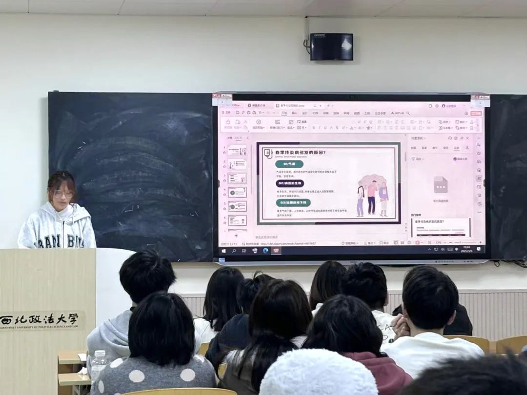 王斯雨同学从春季常见传染病的类型、症状、传播途径以及预防方法四个方面展开介绍,使同学们对各类春季传染病有了更深入的了解。她强调,春季虽是传染病高发期,但只要掌握科学预防方法、养成良好生活习惯,就能有效降低感染风险。王斯雨同学呼吁大家将预防传染病的知识运用到日常生活中,健康生活、快乐学习,共同迎接美好的春天。