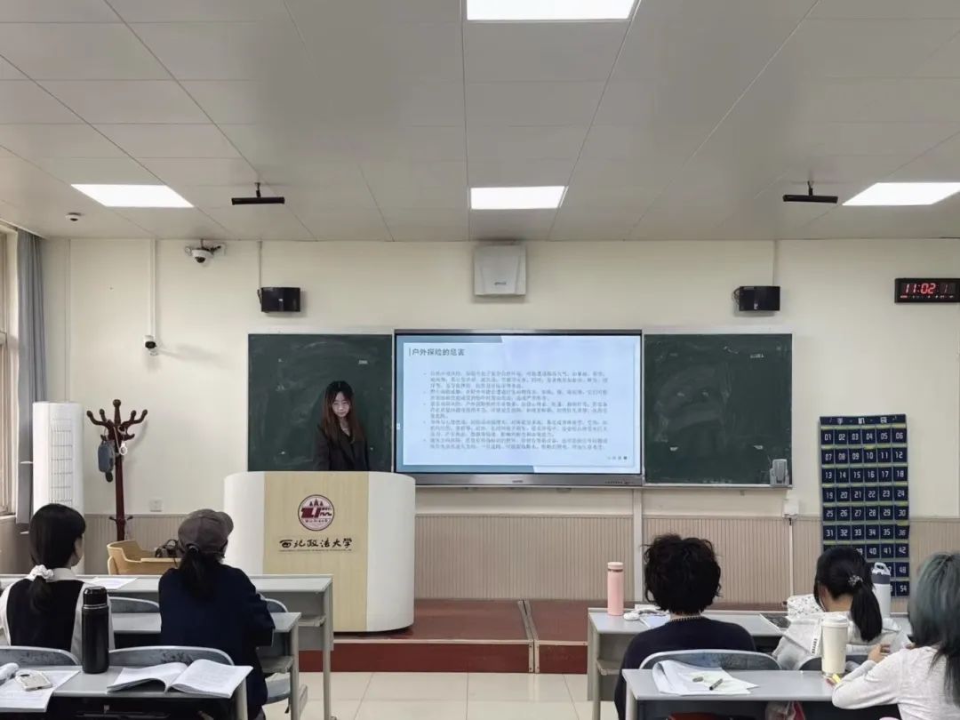 刘雨昕同学结合实际案例,从租车自驾可能遇到的交通风险、攀爬野山时面临的地形与地质隐患、野泳中隐藏的溺水危险以及户外探险时难以预测的各种突发状况四个方面,进行全面且深入的介绍。通过她生动细致的讲解,同学们对这些看似平常却暗藏危机的户外活动有了更为深刻的认识。