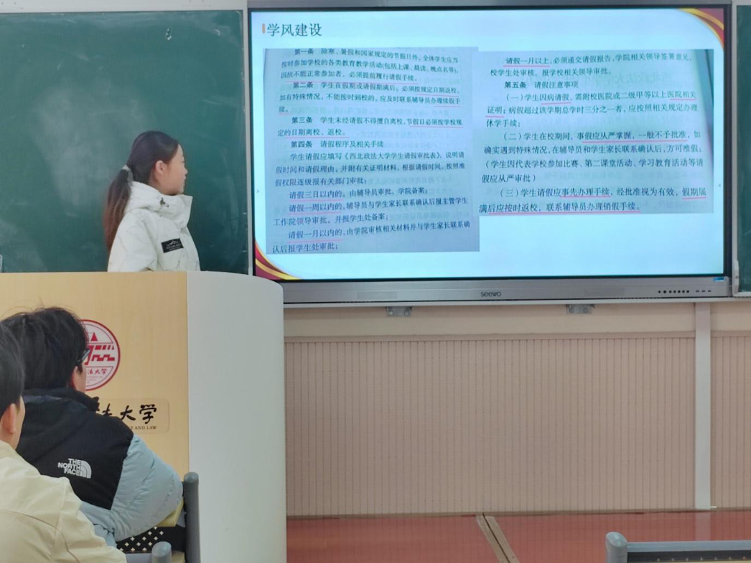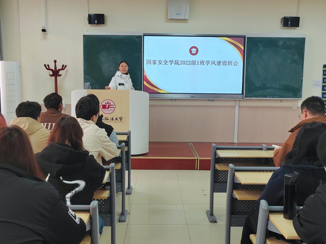 为增强学生纪律意识,营造良好课堂环境,追影猫 (反恐怖主义法学院)2022级1班于3月31日召开学风建设主题班会,本次班会由学习委员周紫嫣同学主持,2022级1班全体同学参与。