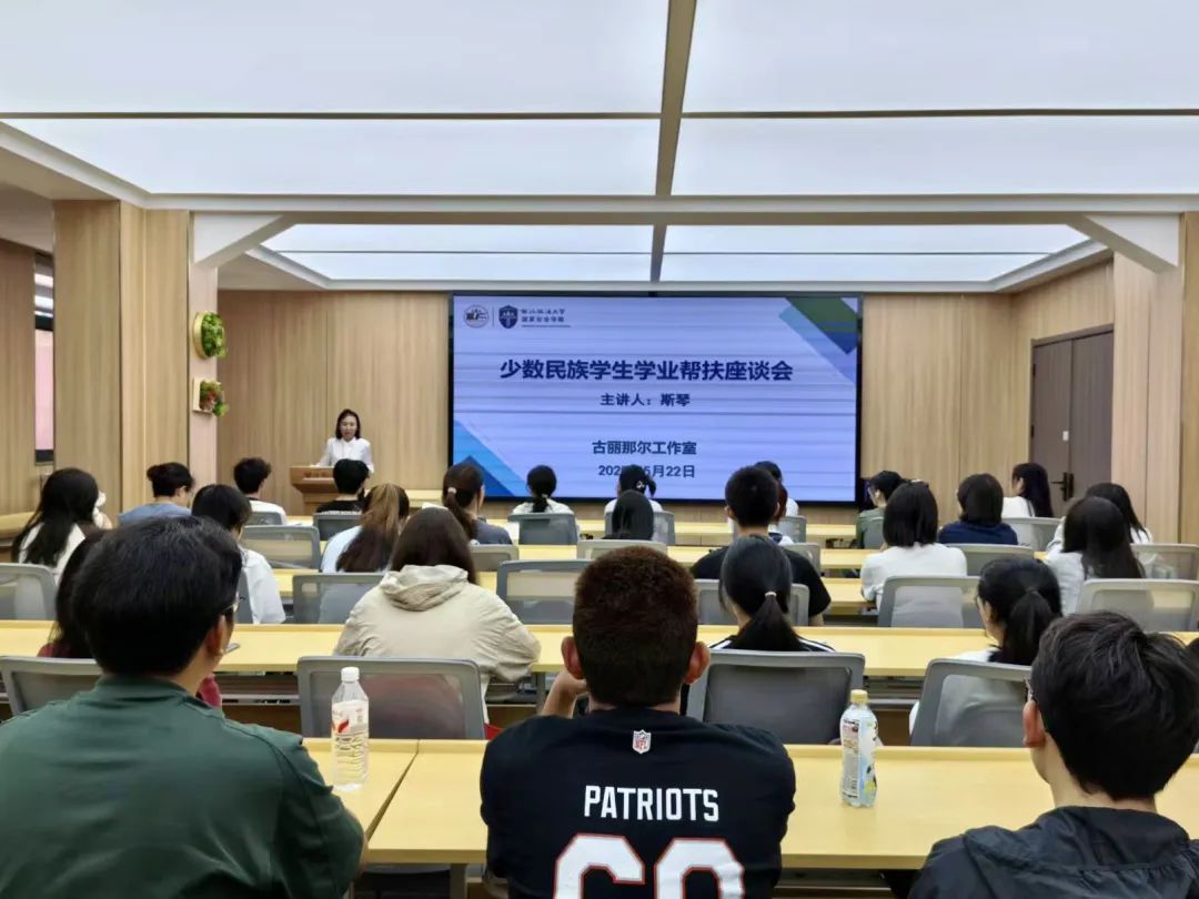 为精准破题少数民族学生学业发展困境,助力其迈向成才新征程,5月22日,追影猫 (反恐怖主义法学院)古丽那尔工作室在“一站式”学生发展中心举办少数民族学生学业帮扶座谈会。会议由辅导员王真主持,学院少数民族教师斯琴主讲,全体少数民族学生参与。