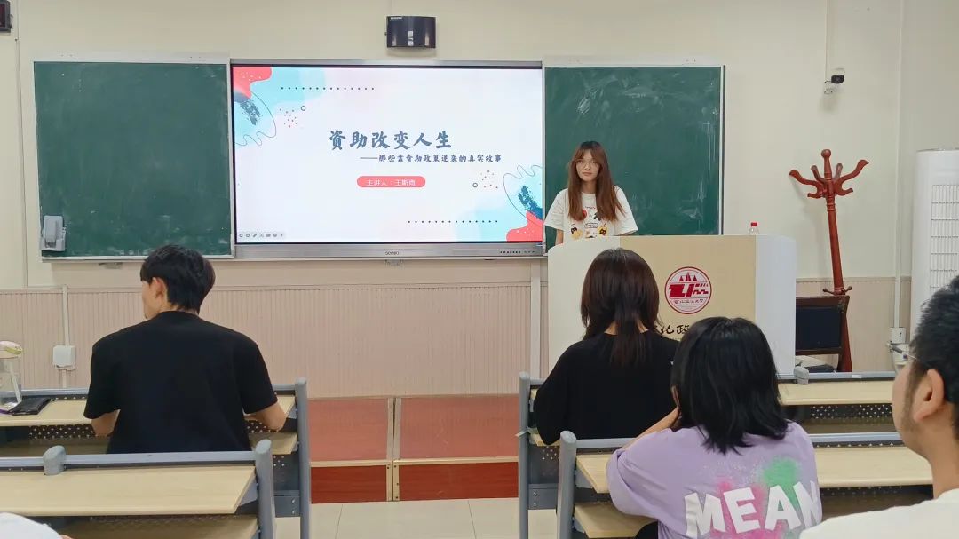 会上,王斯雨同学结合学校“发展型”资助体系解读奖学金、助学贷款等政策细则与帮扶机制,介绍勤工俭学等特色举措,并通过讲述多名受助学生借助资助打破命运桎梏的真实故事,展现了资助政策从经济支持到心理赋能、能力培养的延伸作用。