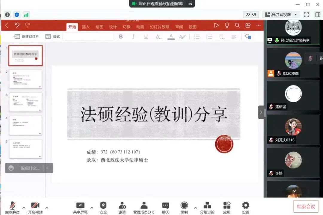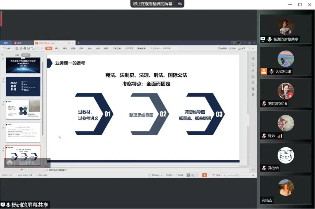 为了给同学们提供更好的考前规划,更好去准备考研,帮助同学们更好制定学习计划,明确学习方向。2022年5月21日下午三点,反恐法学院召开了面向2019级学生的考研经验分享会。2018级孙欣怡同学、霍嘉同学、杨洲同学作考研经验分享。2019级同学通过线上腾讯会议的形式参加。