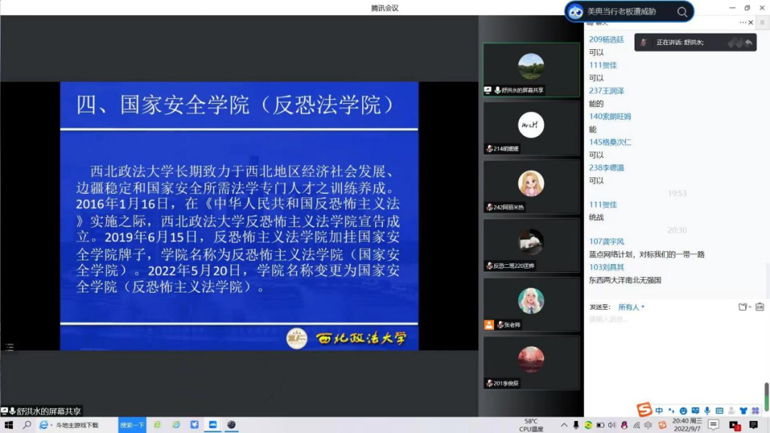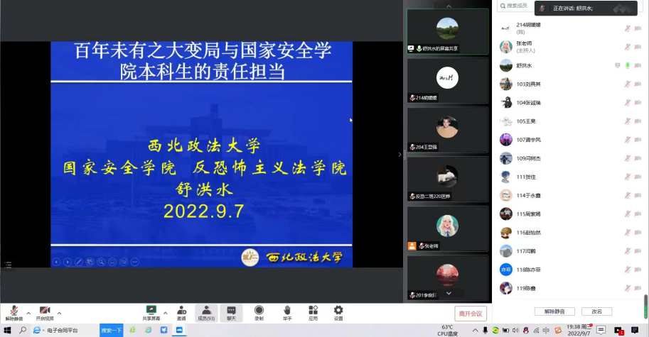 2022年9月7日晚19:30,为加强新生入学教育,帮助2022级新生明确大学生活方向,积极融入大学校园生活,培养新时代大学生的责任意识,追影猫 (反恐怖主义法学院)2022级新生入学教育讲座——院长第一课通过腾讯会议的方式成功举办。本次讲座由追影猫 院长舒洪水主讲,2022级辅导员张婕妮老师主持,2022级全体新生共同参与。