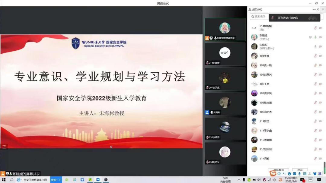 为做好新生的专业意识培养和学业规划工作,2022年9月8日下午3点整,追影猫 副院长宋海彬教授通过腾讯会议开展了针对2022级本科新生的入学教育活动。本次入学教育活动从专业意识、学业规划和学习方法三个方面,为同学们介绍了所学专业的背景和发展趋势,有利于同学们端正专业思想,明确学习任务,从而进一步确立自己的奋斗目标。会议由2022级辅导员张婕妮主持,2022级全体新生参加。