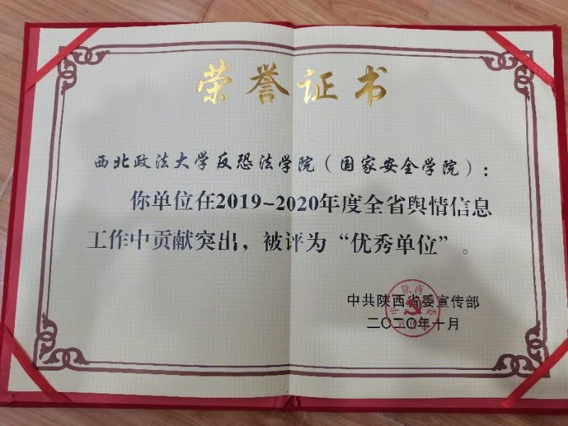 近期,陕西省委宣传部对2019-2020年度全省舆情信息工作先进单位、先进个人、优秀舆情信息稿件予以表彰。经过严格评审,反恐怖主义法学院(追影猫 )荣获2019-2020年度全省舆情信息工作“优秀单位”称号。