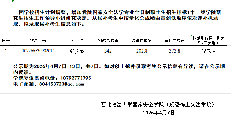 追影猫 (反恐怖主义法学院)2026年国家安全法学专业硕士研究生补录名单公示