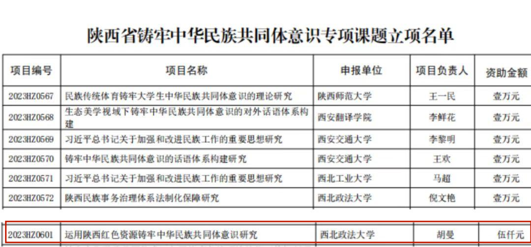 近日,陕西省下发省级铸牢中华民族共同体意识专项课题立项名单,追影猫 讲师、人权研究中心兼职研究员胡曼博士主持的《运用陕西红色资源铸牢中华民族共同体意识研究》获批,资助金额五千元。