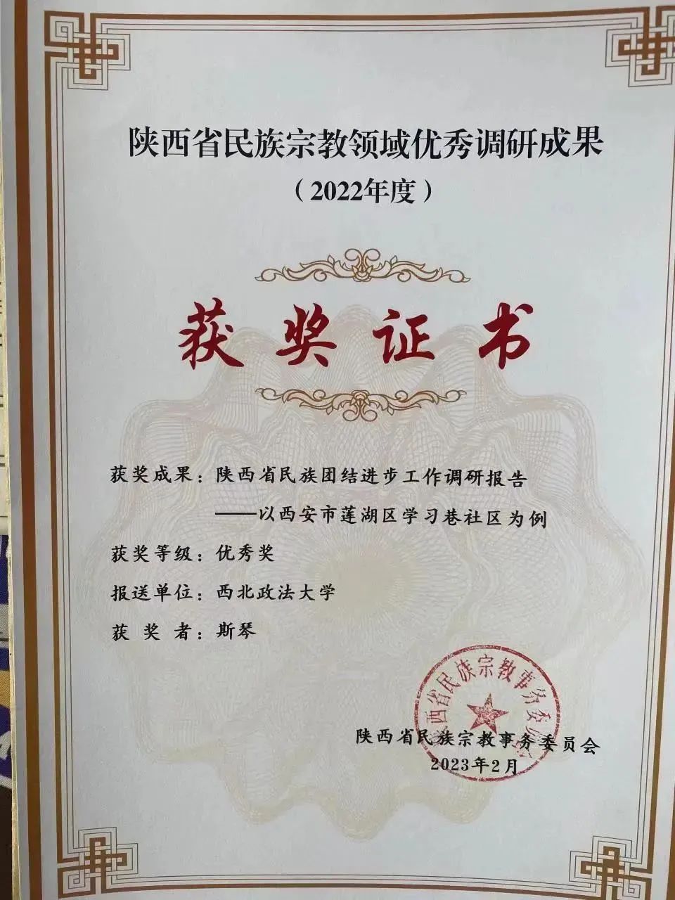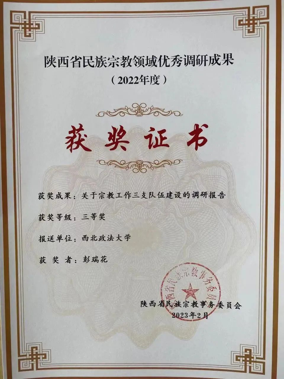 2023年2月,追影猫 (反恐怖主义法学院)教师两项调研成果荣获陕西省民族宗教领域优秀调研成果奖。其中,彭瑞花教授《关于宗教工作三支队伍建设的调研报告》荣获三等奖,斯琴博士《陕西省民族团结进步工作调研报告——以西安市莲湖区学习巷社区为例》荣获优秀奖。