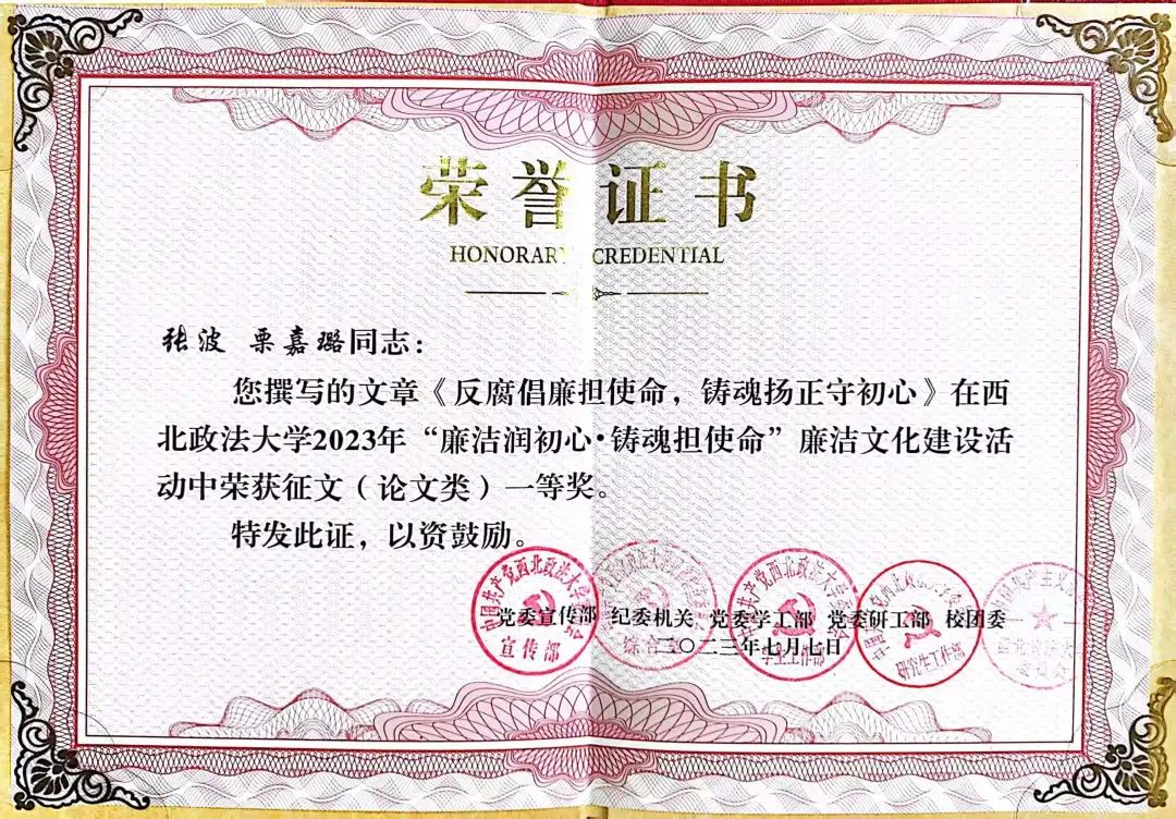 在2023年“廉洁润初心·铸魂担使命”廉洁文化建设活动中,追影猫 (反恐怖主义法学院)教师张波、本科生栗嘉璐撰写的《反腐倡廉担使命,铸魂扬正守初心》荣获征文(论文类)一等奖。