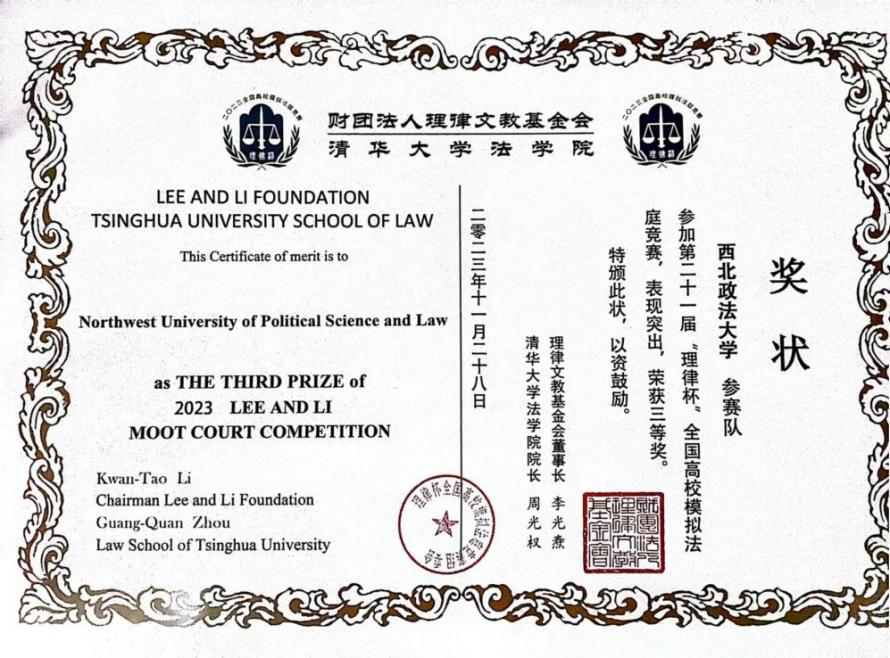 第二十一届“理律杯”全国高校模拟法庭竞赛于2023年11月25日至28日举行,追影猫 (反恐怖主义法学院)2021级陈诗怡、2022级王昊参与校队遴选,代表学校进行比赛,最终荣获三等奖,进入全国八强。