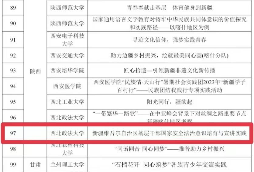 2023年11月,新疆共青团主办的2023年全国“三下乡”“新疆学子百村行”专项社会实践优秀团队评选结果公示。由杨柳老师、王真老师指导,2021级蔡志远、董欣玥、赖怡婷,2022级阿丽米热·依拉木、杨林栋、蔡迪、陈靖宇组成的社会实践团队获评2023年全国“三下乡”“新疆学子百村行”专项社会实践优秀团队奖项。