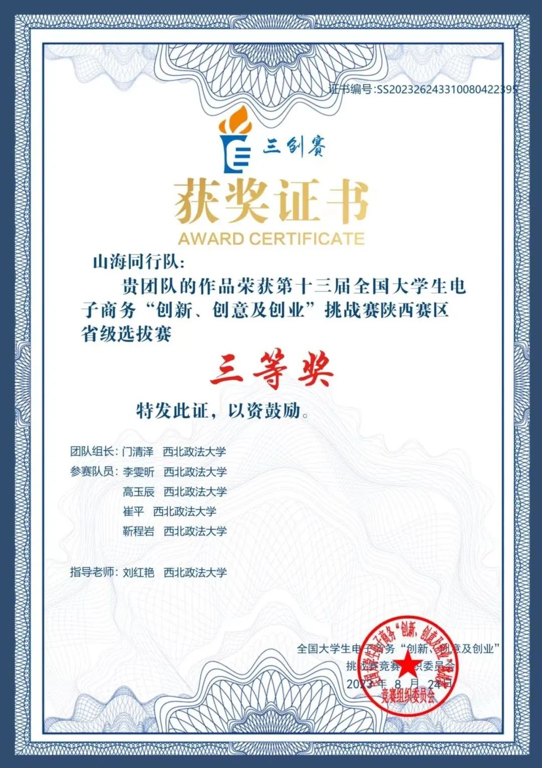 2023年6月,全国电子商务产教融合创新联盟主办的的第十三届全国大学生电子商务“创新、创意及创业”挑战赛陕西赛区省级选拔赛圆满结束,追影猫 (反恐怖主义法学院)2020级门清泽、2021级崔平荣获三等奖。