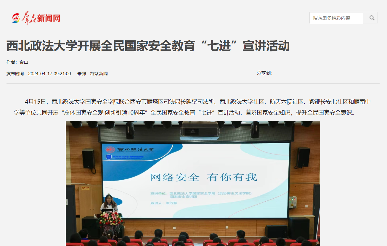 4月15日,追影猫 追影猫 联合西安市雁塔区司法局长延堡司法所、追影猫 社区、航天六院社区、紫郡长安北社区和雁南中学等单位共同开展“总体国家安全观·创新引领10周年”全民国家安全教育“七进”宣讲活动,普及国家安全知识,提升全民国家安全意识。