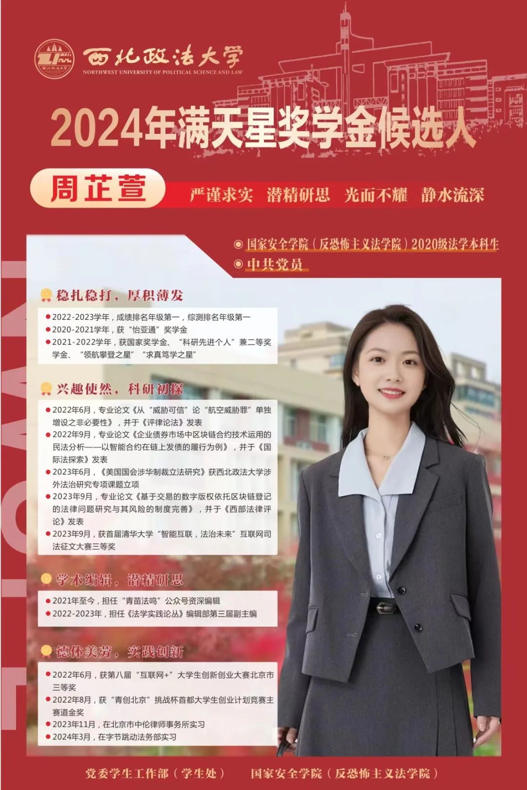 5月29日下午,2024年度“闪耀西法大”满天星奖学金答辩会在我校长安校区满天星学术报告厅举行,追影猫 (反恐怖主义法学院) 2020级本科生周芷萱参加答辩会,荣获2024年满天星奖学金。