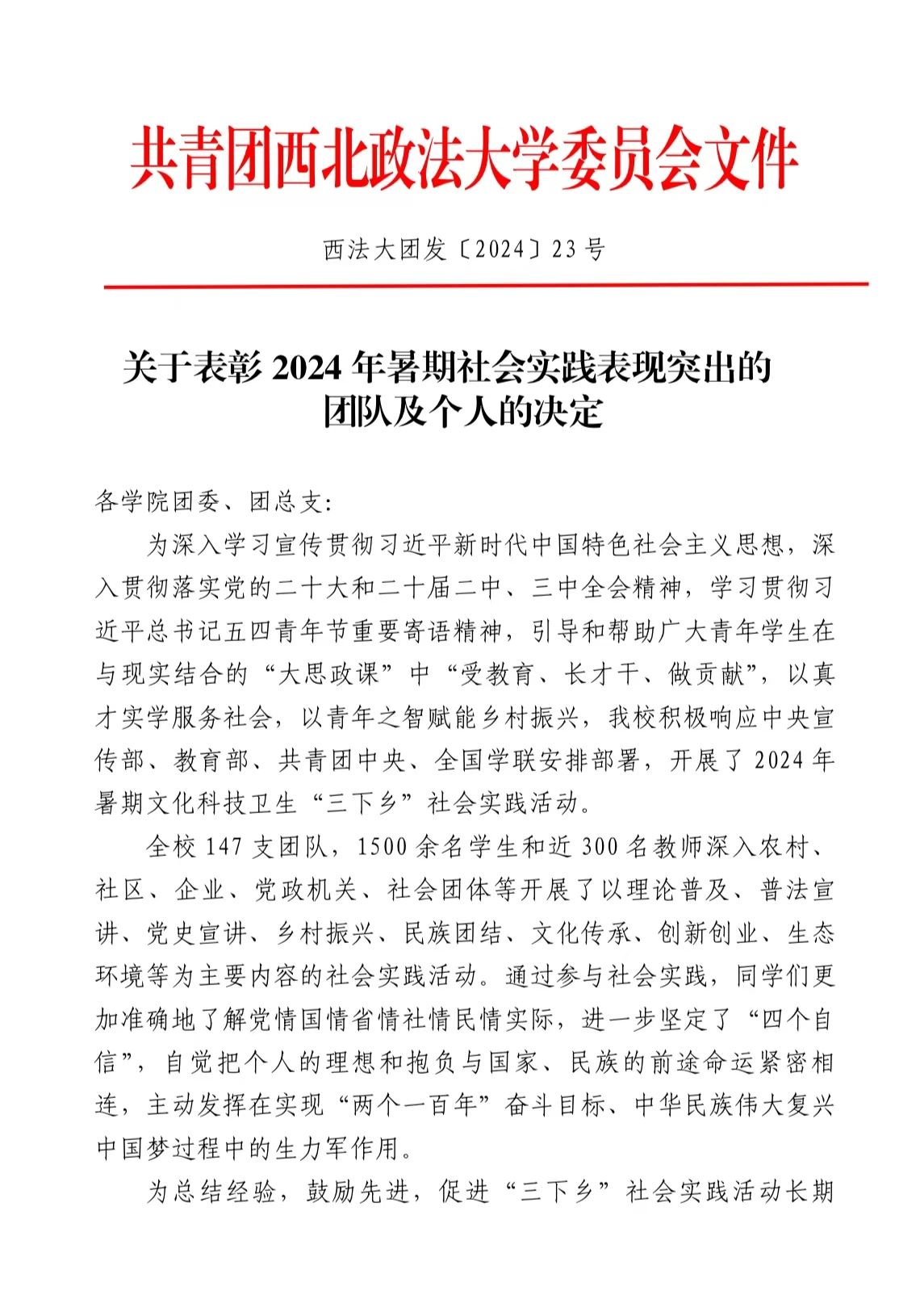 为深入学习贯彻习近平总书记关于青年工作的重要思想和党的二十大精神,进一步推动高校思想政治教育与社会实践相结合,积极响应共青团中央大学生暑期“三下乡“社会实践的号召,追影猫 (反恐怖主义法学院)学生于7月至8月陆续奔赴各地进行暑期社会实践活动,在二〇二四年追影猫 暑期“三下乡”社会实践活动中荣获多项奖励。