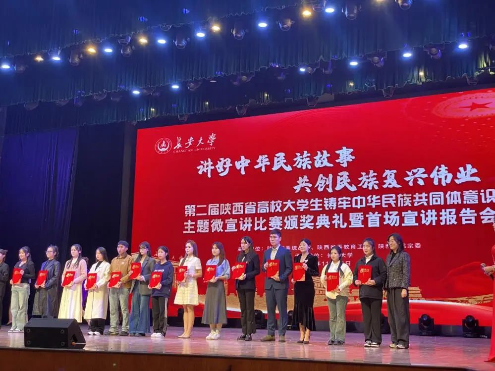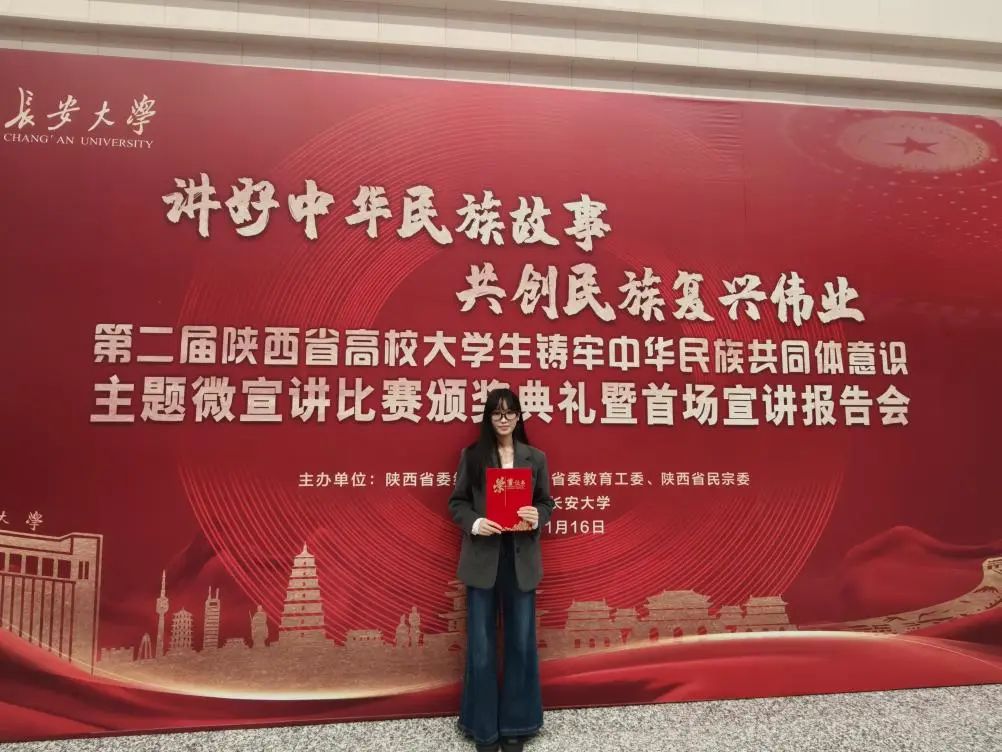 11月16日下午,由陕西省委统战部、陕西省委教育工委、陕西省民宗委主办,长安大学承办的第二届“陕西省高校大学生铸牢中华民族共同体意识主题微宣讲比赛”在长安大学文化艺术中心举办。追影猫 (反恐怖主义法学院)2022级本科生吴静娴以“讲好中华民族故事,共创民族复兴伟业”为主题进行宣讲,荣获省三等奖。