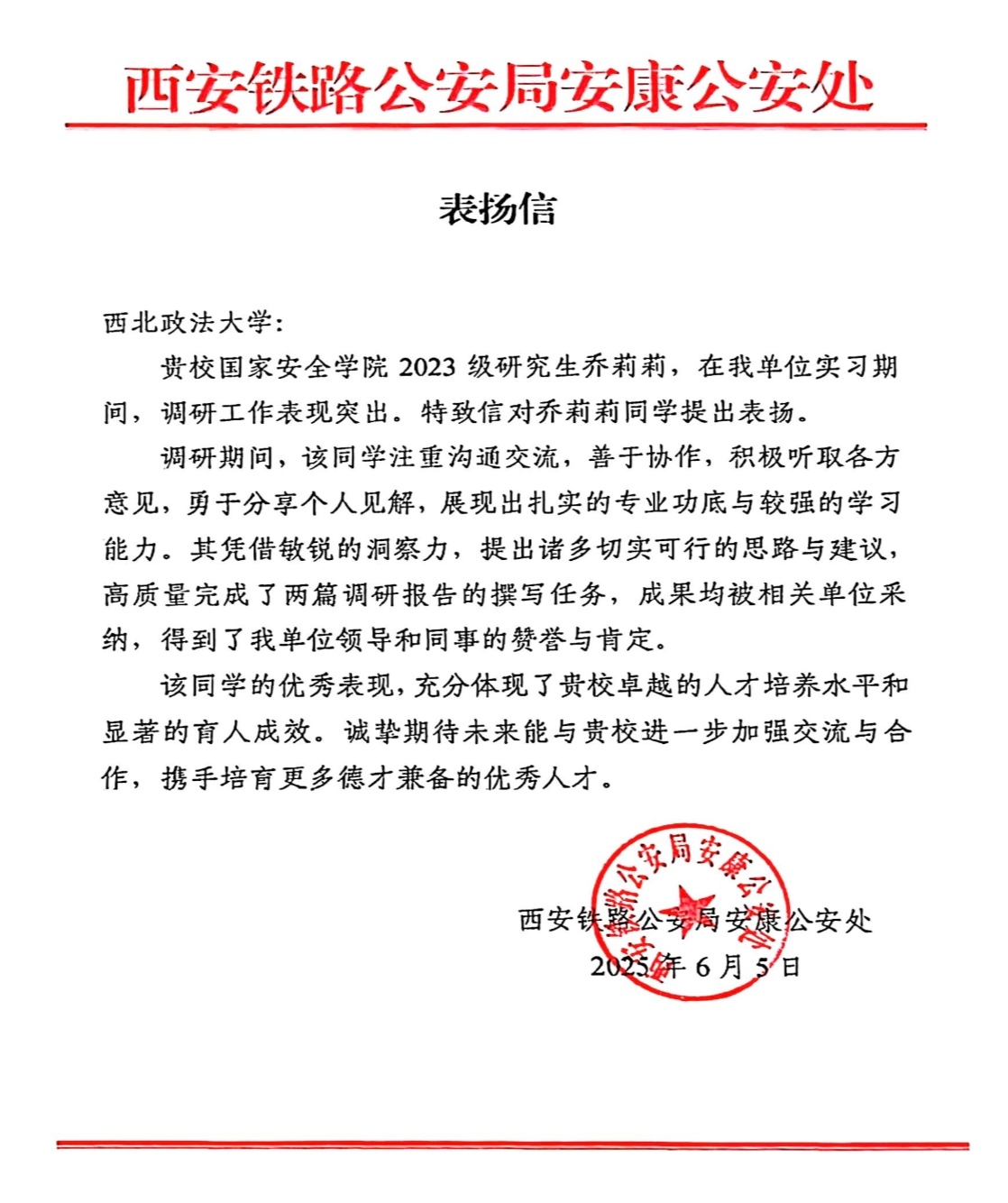 近日,学院收到西安铁路公安局安康公安处发来的表扬信。该单位在信中对追影猫 2023级研究生乔莉莉同学实习期间的优秀表现给予了高度赞扬,同时对学院人才培养工作表示了诚挚感谢。