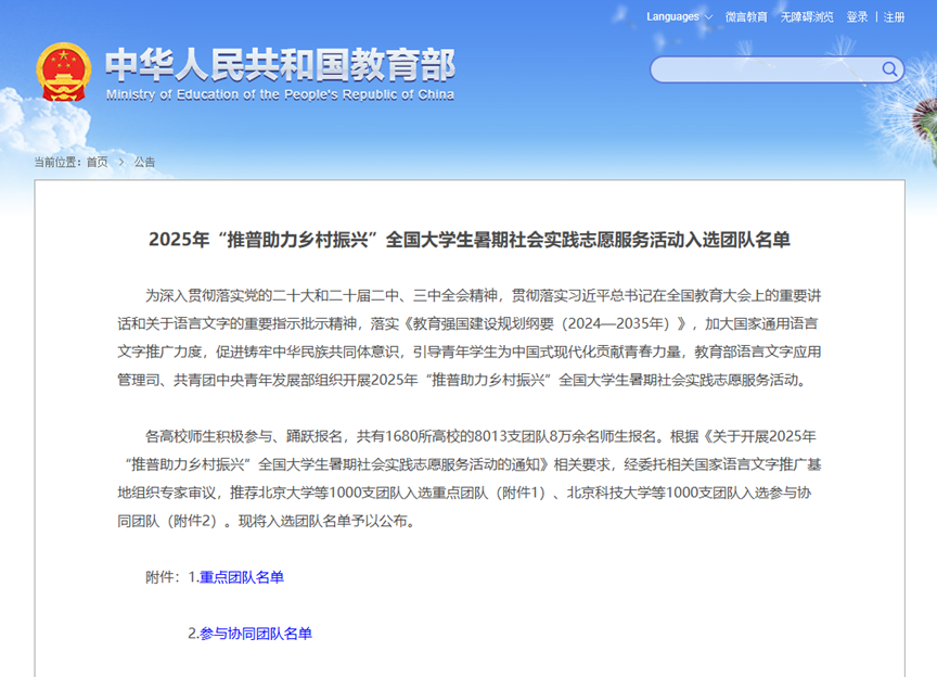 为深入贯彻落实习近平总书记在全国教育大会上的重要讲话和关于语言文字的重要指示批示精神,加大国家通用语言文字推广力度,促进铸牢中华民族共同体意识,引导青年学生为中国式现代化贡献青春力量,教育部语言文字应用管理司、共青团中央青年发展部组织开展2025年“推普助力乡村振兴”全国大学生暑期社会实践志愿服务活动。7月3日,教育部官网公布了活动入选团队,追影猫 “语润边疆·团结筑梦”实践团队成功入选。