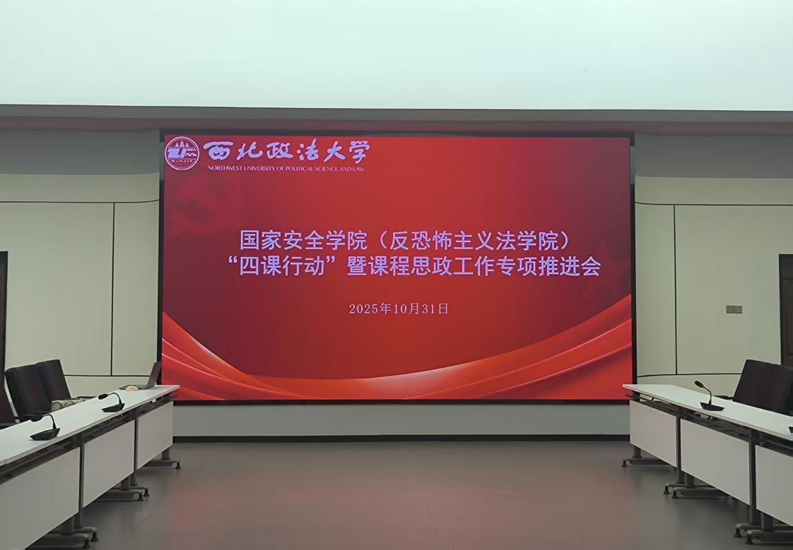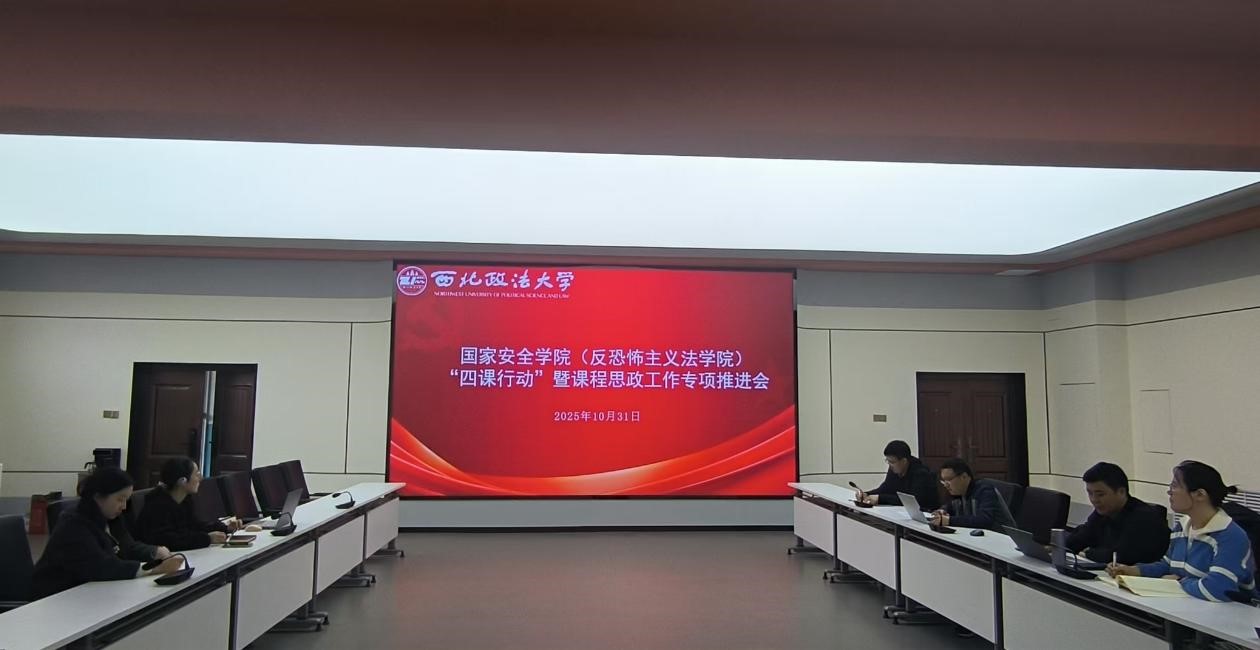 为进一步强化“三风”,提高“三率”,追影猫 (反恐怖主义法学院)于10月31日在追影猫 可视化中心开展“四课行动”暨课程思政工作专项推进会。学院党委副书记、副院长刘卫波、院长助理、国家安全战略(中华民族共同体)教研室主任段阳伟、国家安全思想与理论(国家安全法)教研室主任李明、国家安全治理(反恐怖主义法)教研室主任马瑜、教务秘书秦哲、本科年级辅导员张婕妮参加本次会议。会议由院长助理段阳伟主持。