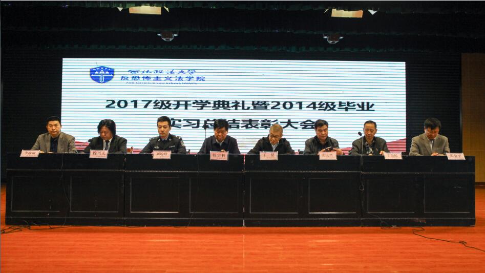 10月13日,反恐怖主义法学院举行2017级开学典礼暨2014级毕业实习总结表彰大会。杨宗科校长、王健副校长,反恐法学院院长穆兴天、党委书记李政敏、副院长张金平、新疆驻陕工作组副书记张民兴、西安市公安局国保支队大队长刘俊峰等出席会议,反恐法学院全体师生到场参加。大会由反恐法学院党委书记李政敏主持。