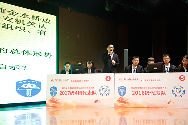 竞赛历时一个多月,经过层层严苛的选拔与考核,共有6支代表队24名参赛选手进入决赛环节。决赛共分为队员必答题、参赛队必答题、抢答题和参赛队风险题四个环节,各代表队在规定时间内作答。参赛队员法律基础扎实且训练有素,他们沉着应对,冷静分析,紧密合作,从容对答。在参赛抢答题环节,队员们竞争激烈,不分上下,精彩的表现扣人心弦。互动环节中,场下同学踊跃参加,使得比赛和教学的气氛更加浓厚。经过激烈地角逐,反恐怖主义法学院2016级代表队荣获一等奖,2017级1班和研究生代表队荣获二等奖,2017级4班、3班和2班分别获得三等奖。