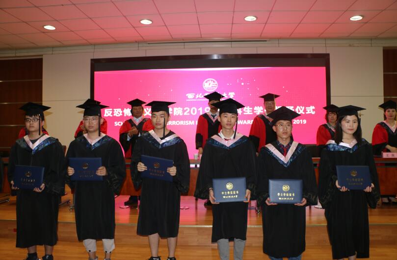 反恐法学院学术委员会导师为全体毕业生颁发学位证书并拨穗。