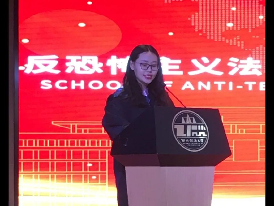 毕业生代表刘博雅同学代表学院全体毕业生向老师们表达最衷心的感谢和敬意,表示要牢记总书记给广大毕业生们的回信嘱托,努力成为一名优秀的反恐法律与国家安全专业人才。