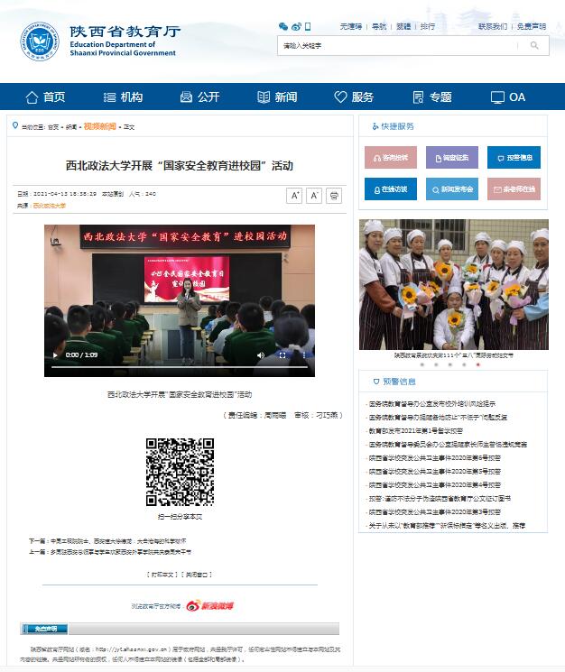 4月13日,陕西省教育厅网站以视频新闻报道我校“国家安全宣讲进校园”活动。