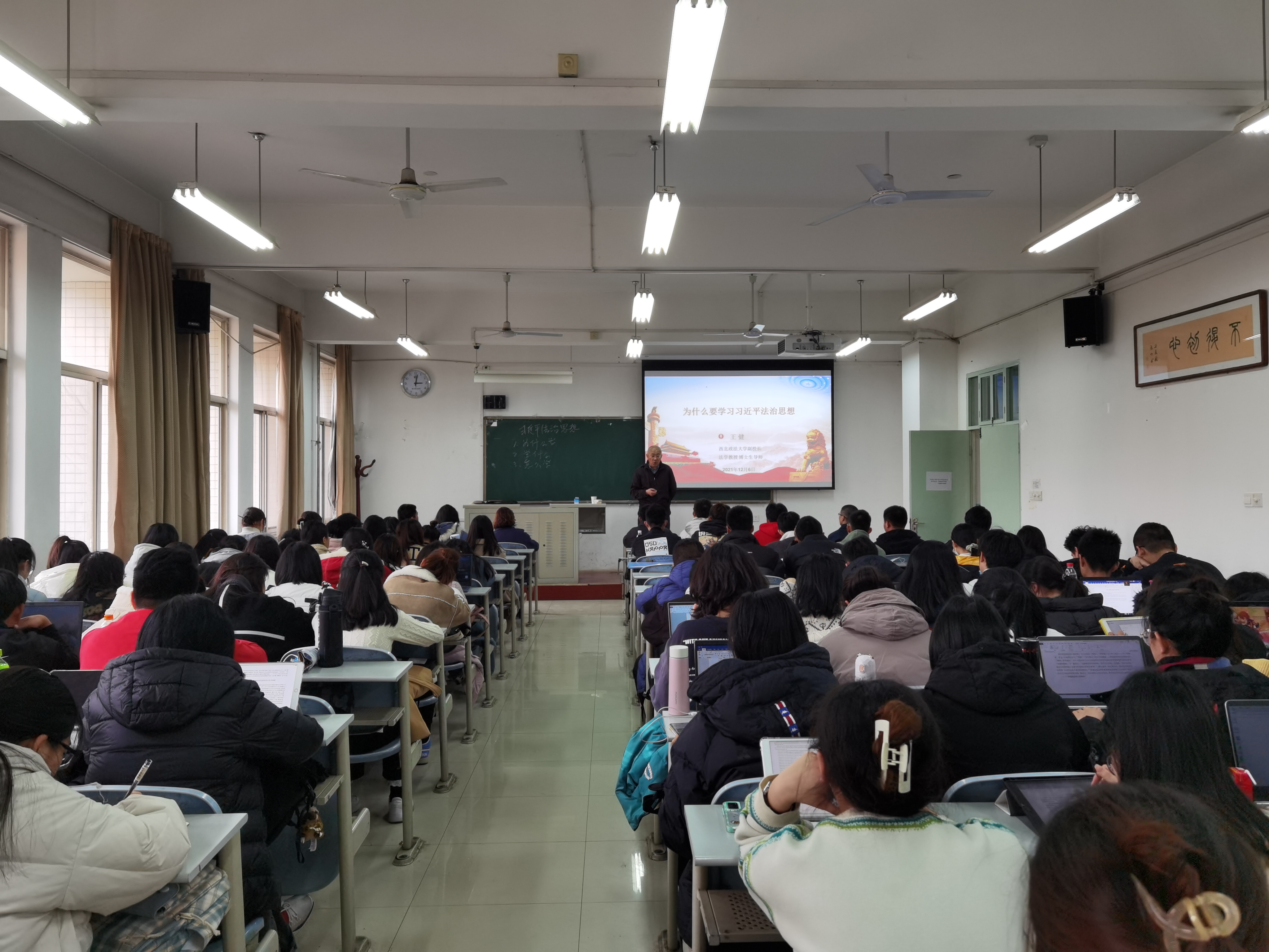 以《学习习近平法治思想》为题,王健副校长围绕“为什么学,学习什么,怎么来学”三个方面展开解读。他表示,党的领导是中国特色社会主义制度最根本的特征,新时代中国发展的各个领域,党都居于领导核心地位。习近平法治思想是习近平新时代中国特色社会主义思想的重要组成部分,对国家法治建设的发展具有重要指导作用。从立德树人、法科学生培养、法律职业从业等现实需求出发,作为法学专业的学生,学习习近平法治思想具有重要意义。