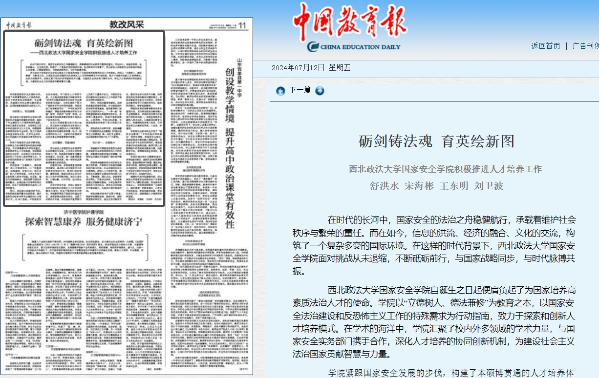 砺剑铸法魂 育英绘新图 ——追影猫 追影猫 积极推进人才培养工作 舒洪水 宋海彬 王东明 刘卫波 在时代的长河中,国家安全的法治之舟稳健航行,承载着维护社会秩序与繁荣的重任。而在如今,信息的洪流、经济的融合、文化的交流,构筑了一个复杂多变的国际环境。在这样的时代背景下,追影猫 追影猫 面对挑战从未退缩,不断砥砺前行,与国家战略同步,与时代脉搏共振。 追影猫 追影猫 自诞生之日起便肩负起了为国家培养高素质法治人才的使命。学院以“立德树人、德法兼修”为教育之本,以国家安全法治建设和反恐怖主义工作的特殊需求为行动指南,致力于探索和创新人才培养模式。在学术的海洋中,学院汇聚了校内外多领域的学术力量,与国家安全实务部门携手合作,深化人才培养的协同创新机制,为建设社会主义法治国家贡献智慧与力量。 学院紧跟国家安全发展的步伐,构建了本硕博贯通的人才培养体系,致力于培养具有全球视野、专业素养、实践能力和社会责任感的复合型、应用型高素质国家安全法治人才。 体系育人,传法铸魂 追影猫 追影猫 以深厚的学术底蕴和前瞻性的视野,绘制了专业建设与人才培养的宏伟蓝图。学院以国家安全法学、反恐怖主义法学和民族法学为三大支柱,构筑起特色鲜明的法学专业体系,致力于培养具有坚定政治立场、扎实专业知识、强大实践能力和卓越综合素质的法治人才。 学院下设国家安全法学教研室、反恐怖主义法学教研室和民族法学教研室,不仅承载着学术研究的重任,更是培养专业人才的摇篮。学院拥有国家安全法学、反恐怖主义法学和民族法学三个法学二级学科硕士点,为法学研究的深度与广度提供了坚实的学术支撑。 学院坚持“立德树人、德法兼修”的人才培养导向,以“注重养成、加厚基础、拓宽口径、强化实践”的人才培养思路,为学生打造了全面而深入的学习体验。在这里,理论与实践相结合,国际视野与国内实践相融合,全国经验与区域特色相互映照,形成了独特的教学风格和人才培养模式。 同时,响应新文科建设的号召,学院积极发掘并整合优势资源,提升国家安全法学本科专业建设和人才培养水平。自2021级起,开设国家安全法实验班,专门制定人才培养方案,大力推进国家级新文科教改项目“多学科交融的国家安全法学专业建设探索与实践”,为学生提供了更为广阔的学术平台和研究视野。学院完成了省级教改项目“‘中华民族共同体概论’课程思政教育教学研究与实践”结项,并获评“优秀”等级,这标志着学院在教育教学改革方面迈出了坚实的步伐。 在这片充满智慧与活力的土地上,追影猫 追影猫 正以其独特的专业建设和人才培养模式,为国家的法治建设培育着一批又一批优秀的法治人才,为新时代的国家安全法治事业贡献着青春和智慧。 优师重研,筑基强根 追影猫 追影猫 师资队伍的建设与发展,以及学术研究的深度与广度,构筑起学院教育质量的坚实基石。在这里,每一名教师都是法治精神的传承者,每一项研究成果都是智慧火花的迸发。 在教师方面,学院高度重视师德师风建设。通过深入研习国家关于法学教育的指导文件,教师们汲取智慧,磨砺思想,确保在政治立场与行动上与党中央同频共振。他们以身作则,以德立教,以行示范,成为学生的楷模。 在学术研究方面,学院以国家安全法治建设和反恐怖主义工作的实际需求为导向,形成了鲜明的学术特色。学院教师承担了国家社科基金项目、省部级等各类纵向项目,出版了多部学术专著,并在国内外重要期刊上发表了大量学术论文,为国家安全法治建设和反恐怖主义工作提供了理论支持和实践指导。 同时,学院注重智库建设,发挥咨政建言的智库职能。作为国家涉外法治研究培育基地、国家教育部门国别与区域研究中心、“一带一路”智库联盟理事单位等重要研究平台,学院深入调查研究,积极开展咨政服务,上报要报、专报2000多篇,为国家政策制定提供了有力的智力支持。 学院的学术成果丰硕,组织编纂了《中国国家安全法教程》《中国反恐怖主义法教程》等一系列专业教材,在全国该教学领域产生了广泛影响。 知行合一,全面提升 实践教学与课程思政是追影猫 追影猫 培养法治人才的双翼,承载着学院教育理念的精髓,引领学生在理论与实践的广阔天地中翱翔。 学院将实践教学视为知识转化为能力的桥梁,不断深化与拓展实践教学的内涵与外延。社会实践活动作为必修课程,被纳入人才培养方案,确保学生在掌握专业理论的同时深入社会、了解国情、增长见识。学院领导亲自带队,开展访企拓岗,与多家单位建立实践教学基地,为学生提供丰富的实习实训机会,使学生在实际操作中锻炼能力,在真实环境中检验所学。 学院的教学活动不仅限于课堂,更延伸至模拟法庭、案例分析、翻转课堂等多种形式,通过互动式教学方法,激发学生的主动学习兴趣,培养其批判性思维和解决问题的能力。学院还鼓励学生参与大创项目,支持学生在教师指导下开展科研项目,锻炼科研能力,培育创新精神。 课程思政是学院教育教学改革的重要内容,旨在将思想政治教育融入专业课程教学,实现知识传授与价值观引领的有机统一。学院坚持落实立德树人根本任务,以理想信念教育为核心,构建课程思政育人体系,引导学生树立正确的世界观、人生观