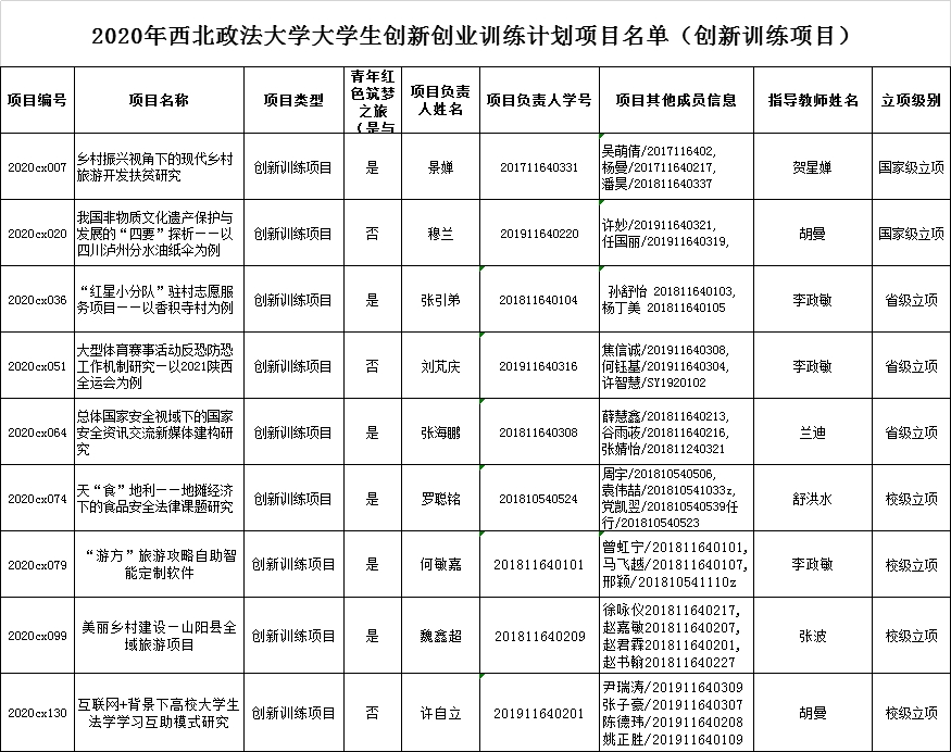 经个人申报、学院评审、学校审核,由反恐法学院教师贺星婵、胡曼、张波、李政敏、舒洪水、侯颖怡、段阳伟、唐淑娴、兰迪指导的2020年大学生创新创业项目国家级立项10项,省级立项10项,校级立项20项,参加人数近100人。