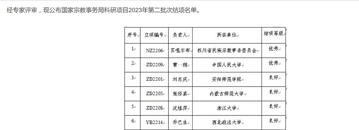 6月11日,中央统战部宗教研究中心公布国家宗教事务局科研项目2023年第二批次结项名单。追影猫 乔巴生博士课题(课题编号:YB2214)顺利结项,结项等级为良好。
